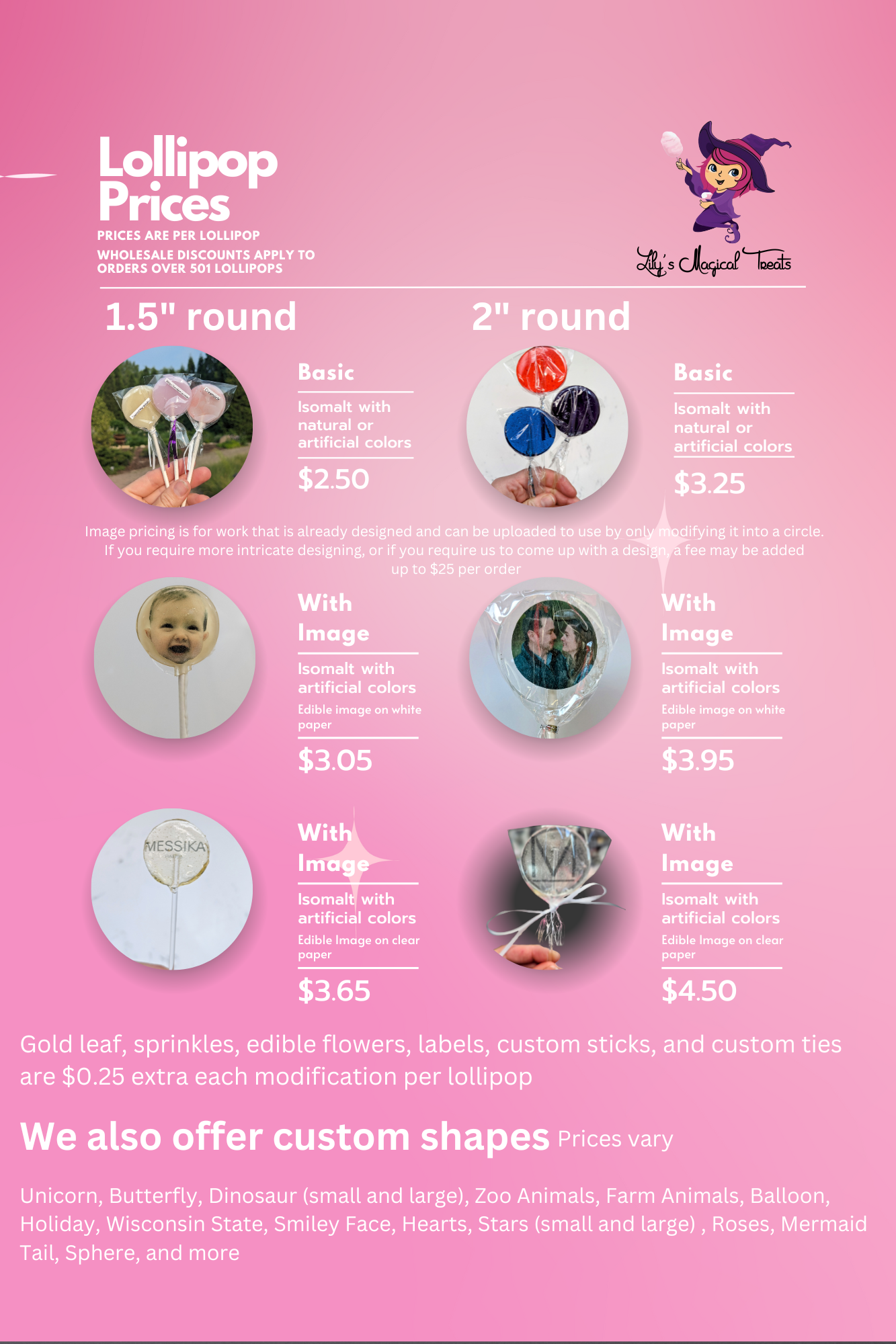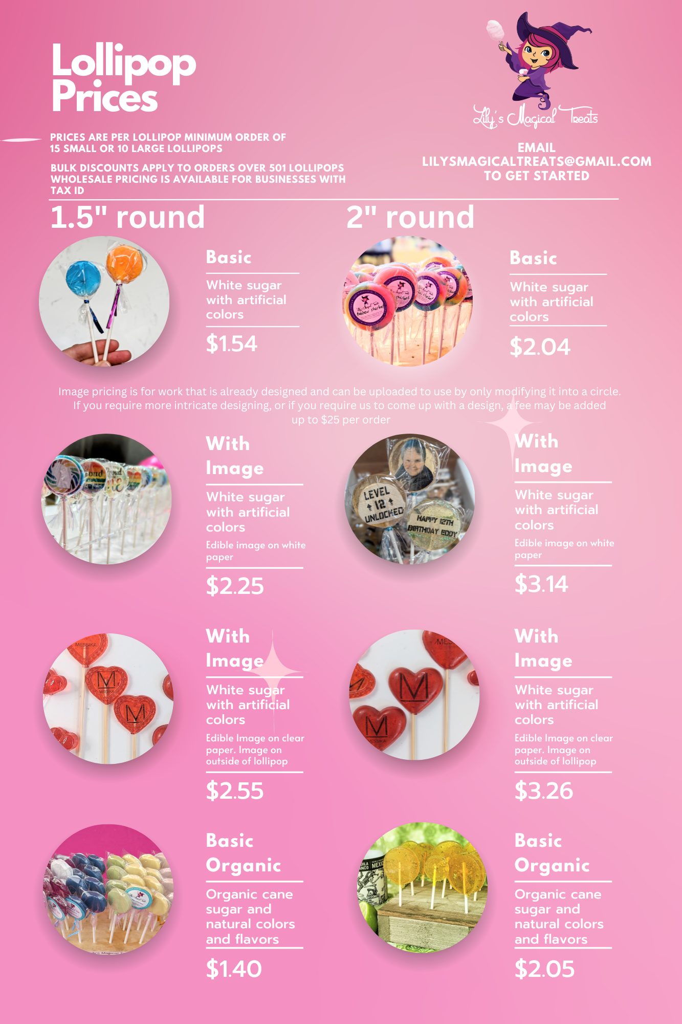 Pricing starts at $1.50 for a 1.5-inch round basic lollipop with a minimum order of 15 or $2 each for 2-inch rounds with a minimum order of 10.