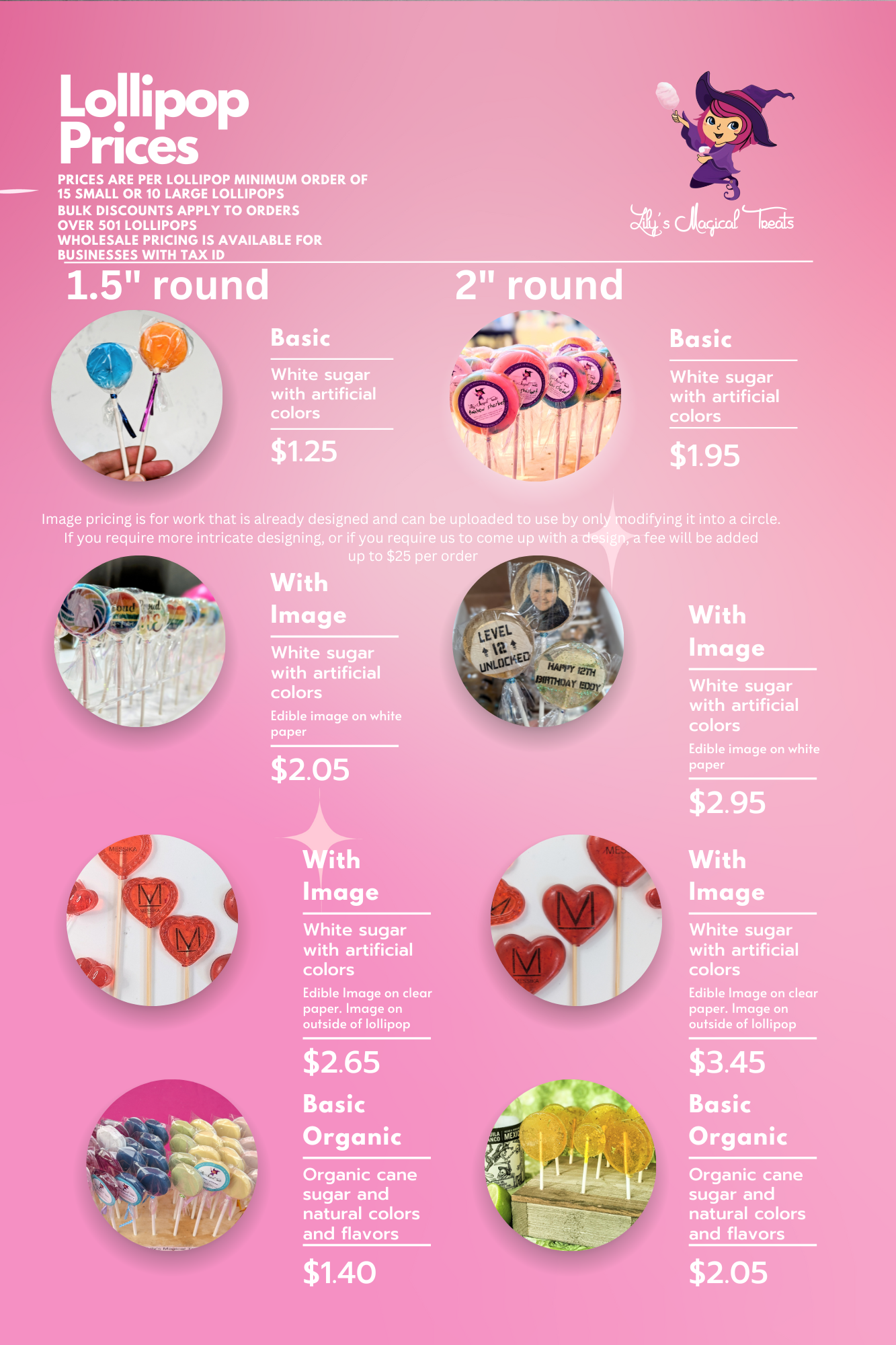 Pricing starts at $1.50 for a 1.5-inch round basic lollipop with a minimum order of 15 or $2 each for 2-inch rounds with a minimum order of 10.