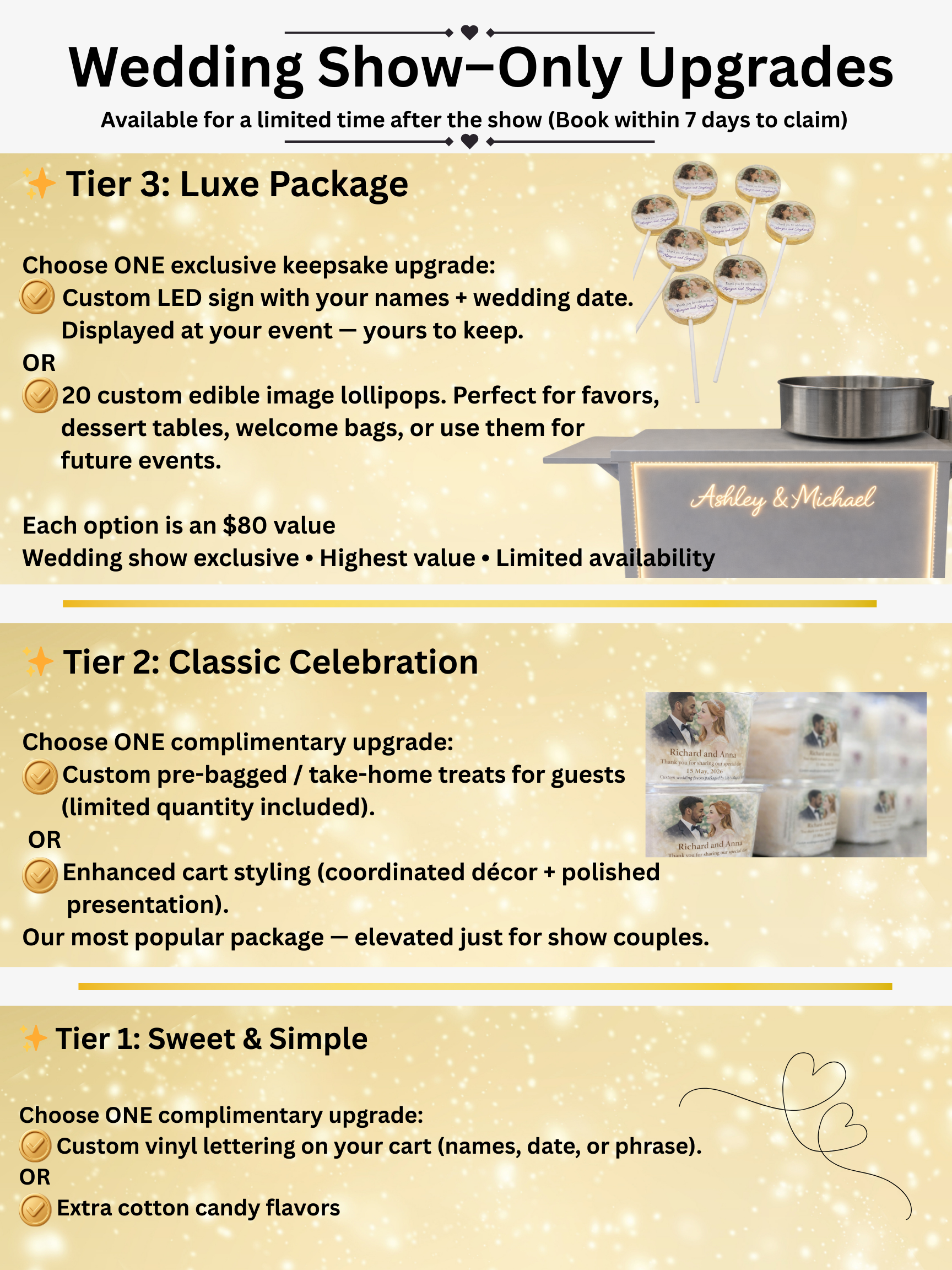 Wedding shows are exciting — and overwhelming. With dozens of vendors and limited time, it’s easy to walk away inspired… but unsure how to make decisions. When it comes to dessert, many couples don’t realize how different vendors and services can be. Asking the right questions at a wedding show can help you quickly narrow down what actually fits your wedding. Here are five questions couples often forget to ask — but shouldn’t. 1. “Is this a live service or pre-made?” This is one of the most important distinctions. Some dessert vendors provide: Pre-packaged favors made ahead of time Others offer: Live, made-on-site experiences where guests interact and watch treats being made Live services create energy, movement, and moments — while favors are perfect for thank-you gifts or table settings. Many couples choose both, but it’s helpful to know what you’re looking at. 2. “When does this work best in our timeline?” Not every dessert option fits every part of the day. Ask vendors when their service works best: Cocktail hour Dessert service Late-night during dancing Timing affects guest experience more than couples expect, and the right vendor will help guide you — not just sell you something. 3. “How customizable is this really?” Customization can mean very different things. Good follow-up questions: Can this match our color palette? Can flavors be customized? Is signage included? Can names, dates, or logos be added? Dessert is often one of the easiest ways to tie your theme together — when customization is truly flexible. 4. “How does this work with our venue?” This question helps avoid surprises later. Things worth asking: How much space is needed? Is power required? Can it be done indoors or outdoors? Have you worked with venues like ours before? Experienced vendors are used to coordinating with venues and planners — and that matters. 5. “What happens after the wedding show?” This is the question many couples don’t ask — but should. Ask about: Wedding-show–only upgrades or incentives How long offers are valid When popular dates typically book What’s required to officially reserve your date Wedding shows often come with limited-time perks , and knowing the timeline helps you make confident decisions afterward. Final Tip for Wedding Show Couples You don’t need to book everything at the show — but you should identify the vendors you want to follow up with. If a dessert vendor: Answers questions clearly Helps you think through timing Makes customization feel easy That’s usually a great sign. ✨ If you’re attending a wedding show, feel free to ask us these exact questions — we’re happy to walk through what works best for your day. 📋 Printable Checklist (Text You Can Turn Into a PDF) Wedding Show Dessert Vendor Checklist ☐ Is this a live service, pre-made, or both? ☐ When does this work best in our wedding timeline? ☐ What customization is included vs. extra? ☐ Does this work with our venue and space? ☐ Are there wedding-show–only upgrades or booking perks? Tip: Star the vendors you want to follow up with after the show.